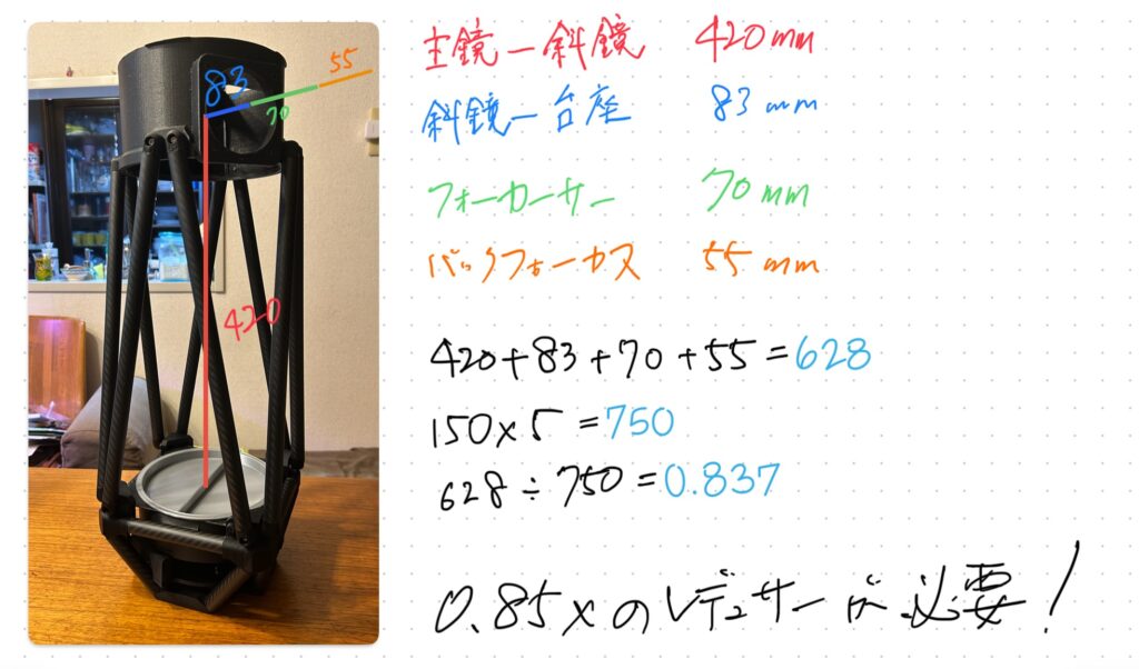 手書きの雑な分析ですが、焦点距離などおおよそわかってきました。ここで0.85xのレデューサが必要と書いていますが、基本間違いですよね。最近わかったことですが、もともと主鏡D130で作られていたのものを無理やりD150に変更したのではないかと推測しています。理由は・・・