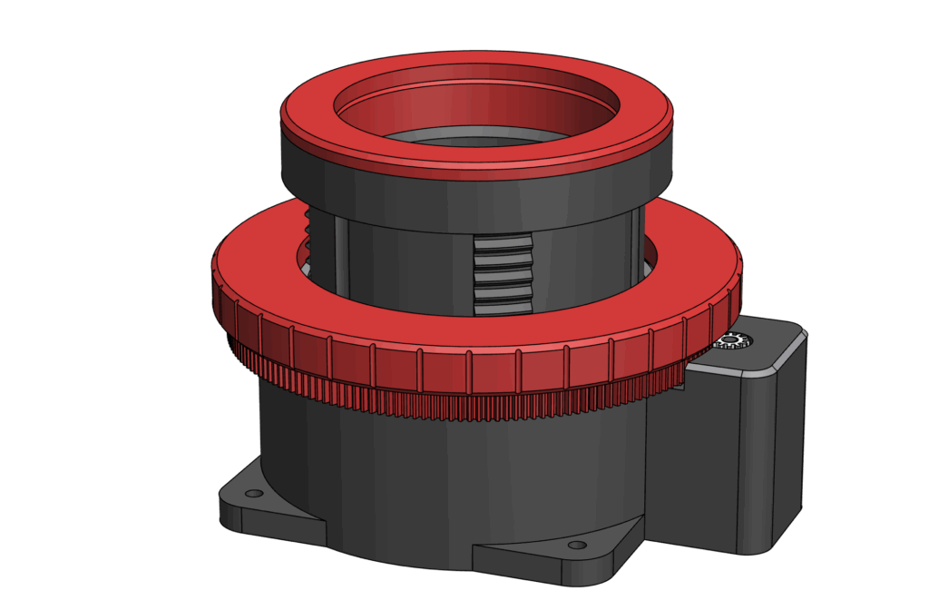 PrintableやThingiversなどのデータを参考にさせてもらいましたが、どれも内部の筒をギアで支持する設計になっていました。これだとギアのガタがそのままファーカーサのガタに直結します。ギアはとにかくファーカスを合わせることだけを担い、内部の筒の支持は違う形で行わなければガタをなくすことは難しいと思います。