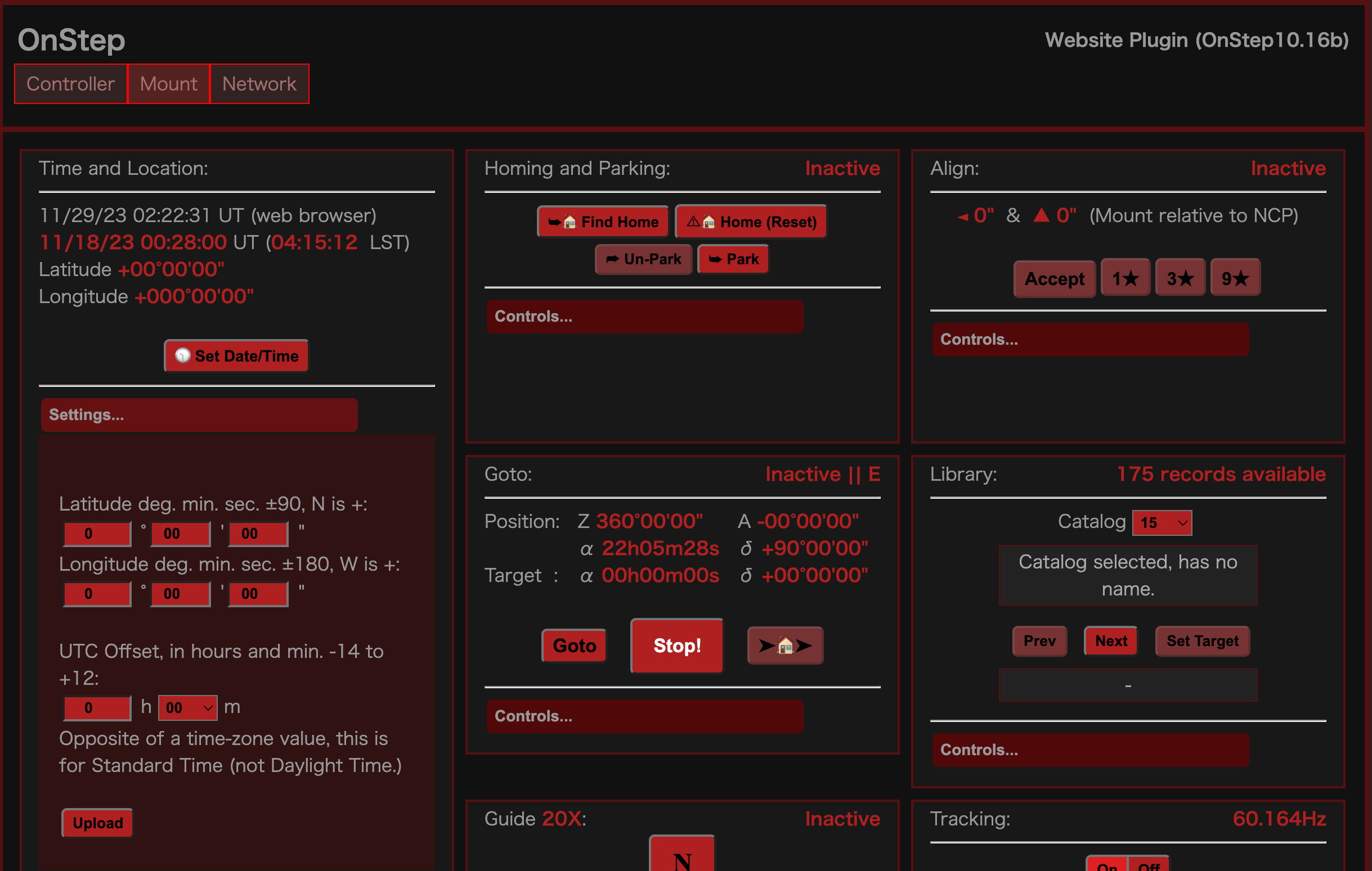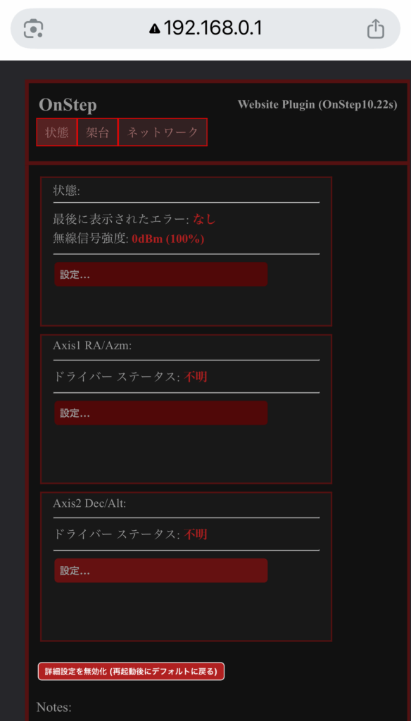 OnStepXのWebsiteプラグインを利用してブラウザで各種設定を行います。Websiteプラグインがをインストールしていることが前提です。設定できる項目は限定されますが、ファームウェアを書き換えずに変更できるのは非常に便利です。