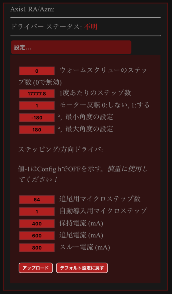 状態ページのAxis1 RA/Azmの設定を開きます。