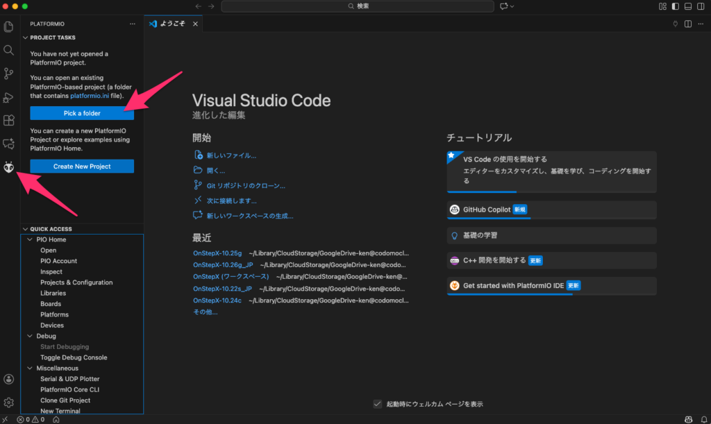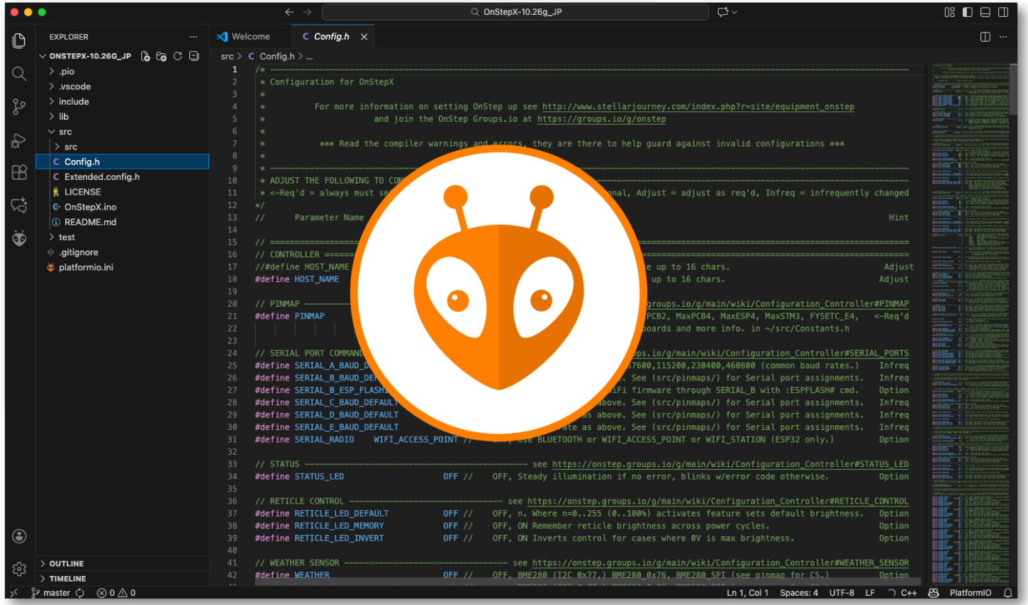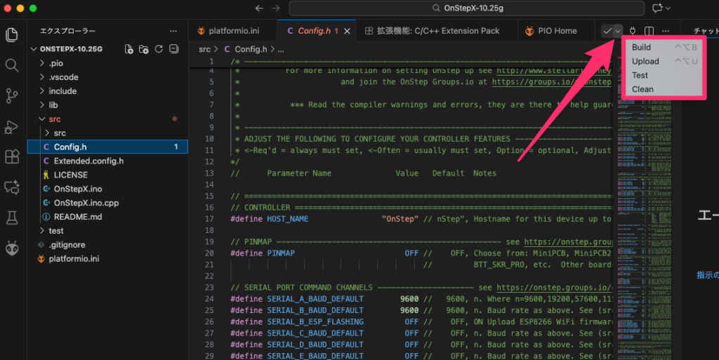 前回は、PlatformIO IDEを使う環境を整えました。ここからは、PlatformIOでOnStepXファイルを開き、ESP32基板にアップロードするまでの手順を書いていきます。