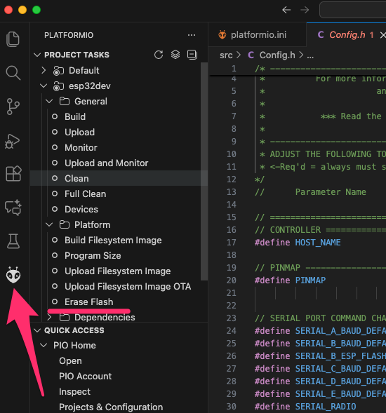 蟻さんマークをクリックし、PROJECT TASKS > esp32dev > Platform > Erase Flashをクリックするとあっという間に消去完了します。