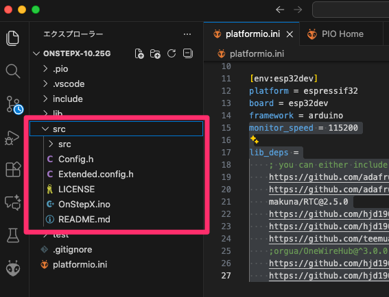 今までのOnStepX関連のファイルはsrcフォルダに移動しています。srcファイルの中には以前からあるsrcフォルダがあります。今までArduino IDEでは同時に開けなかった深い階層のファイルも表示・編集をすることができ、非常に便利です