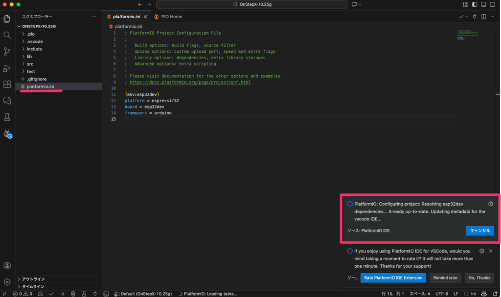 まずは、platformio.iniファイルが開きます。同時に依存ファイルなどのアップデートが行われます。